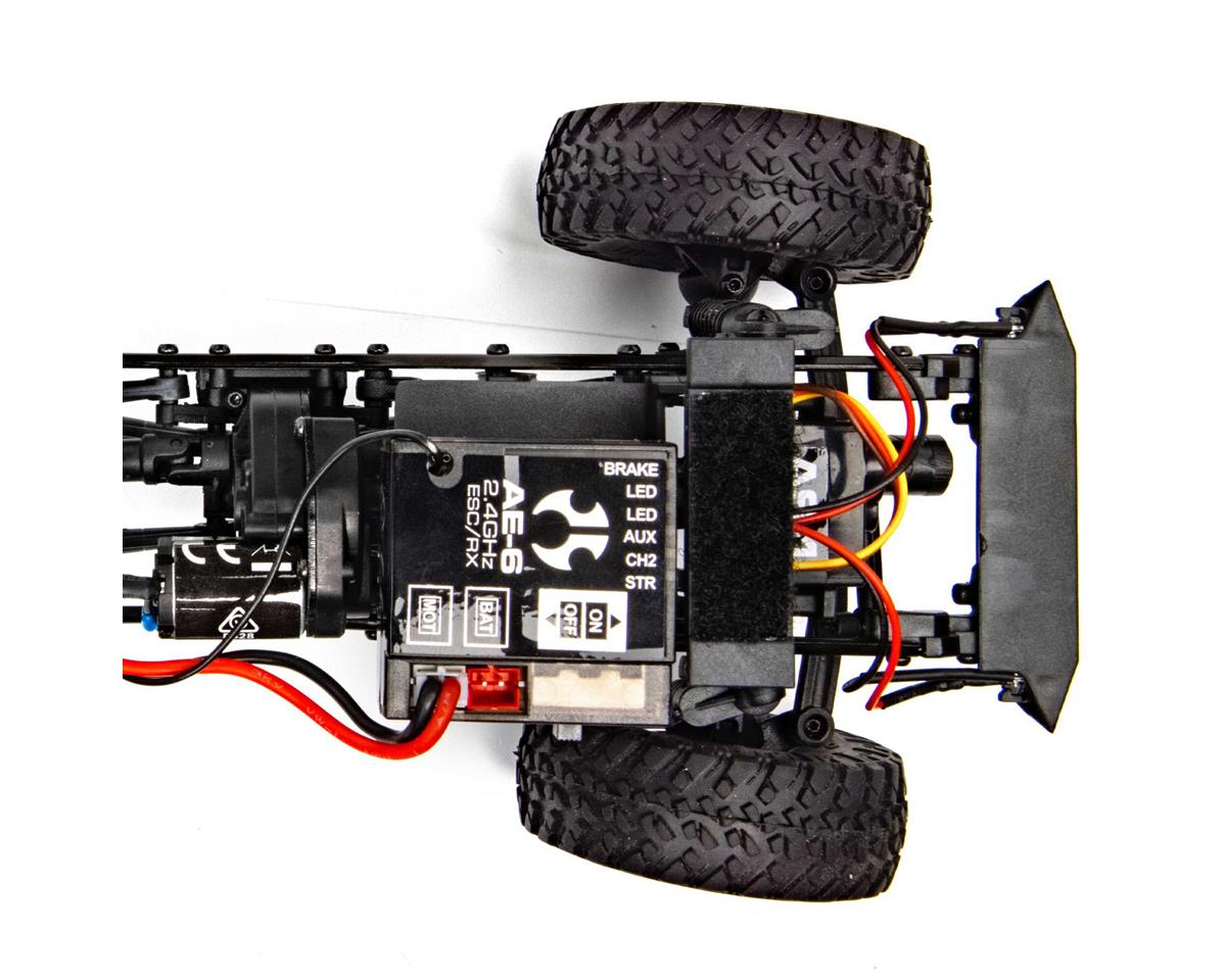 For extreme crawling performance, this mini crawler has been extended 22mm to increase stability and allow a more scale fitment of the body. The axles use steel front and rear axles, steel stub axles and steel dogbones to give you peace of mind while tackling any obstacle. An 88T motor and 2S LiPo battery are used to provide precise, dependable control. The detailed body rides on licensed KMC Machete wheels with scale Nitto Trail Grappler M/T tires. The body uses a hinged designed, allowing for quick battery access for less downtime on the trails. Two LEDs are preinstalled into the front bumper for great night crawling options. The SCX24 Jeep JT Gladiator comes ready-to-run with radio and electronics included.