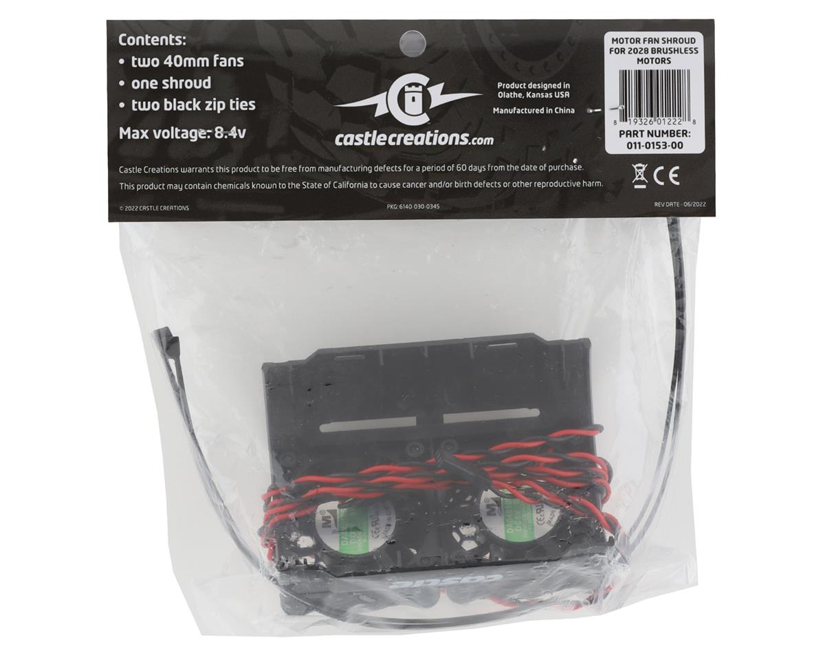 The Castle Creations 2028 Series 40mm Motor Cooling Fan provides ample cooling for the most demanding of situations. With the ability to plug into a traditional receiver port this dual fan setup is an easy addition to aid in cooling for Castle 2028 (or 56mm diameter) motors. Simply slide the mount over your motor and secure it with two zip ties and you are ready to go!