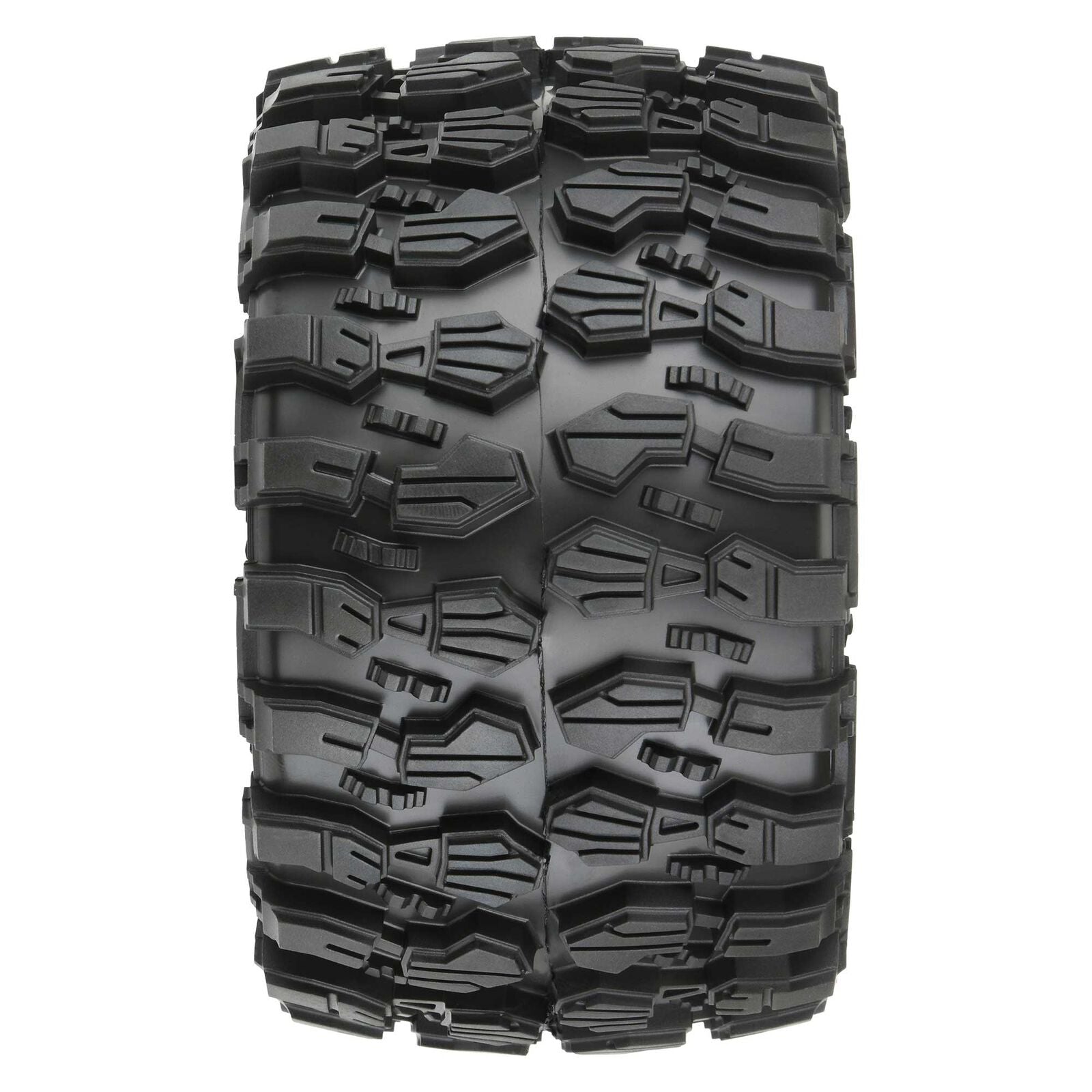 This is a pair of pre-mounted Hyrax 2.8" Tires on Raid Removable Hex Wheels. Pro-Line is very excited to announce the Hyrax 2.8" tire pre-mounted to the Raid Black 6x30 Removable Hex wheel! We take the guesswork out of your glue job by doing the mounting for you so you can spend more time having fun!